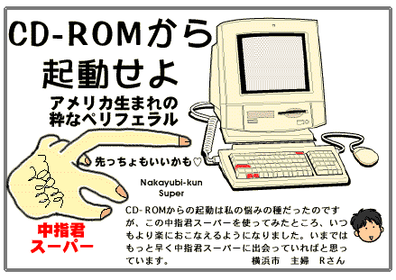 【掲載者注】CD-ROM起動しかできない「中指君スーパー」は、PRAMクリアはもちろんCD-ROM起動にも対応している「三ところ責めくん」の敵ではありません。しかも、「三ところ責めくん」はすでに特許申請中ですので大丈夫です(嘘)。