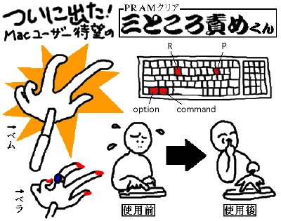 【PRAMクリアひとくちメモ】難しい話は省略しますが、Macの調子がおかしくなったら、とりあえずPRAMをクリアしてみるのがMac使いの掟です。それはキーボードの「P」と「R」と「option」と「command」の4つのキーをいっぺんに押しながらMacを再起動するというもので、毎回毎回、ピアニストになった気分で、つい眉間にタテジワ寄せながらやってしまいます。「ドカベン」の殿馬くんのように、指の間の水掻きを切っておけばよかったと思っているのは、わしだけではありますまい。